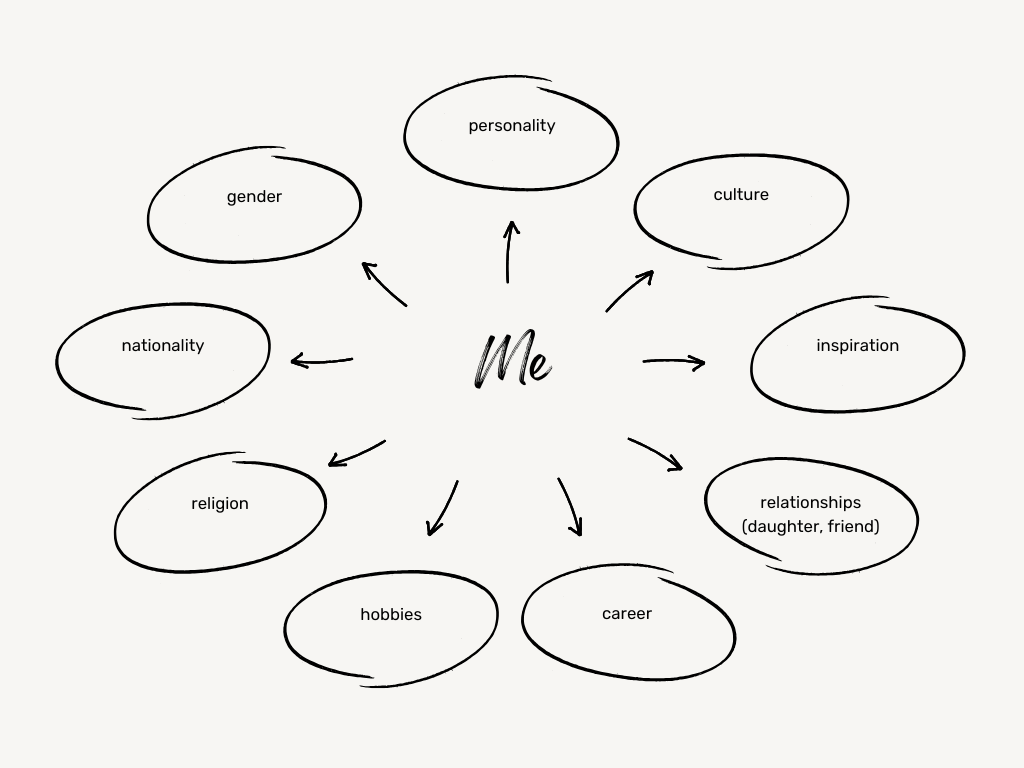 Inspired, I decided to create my own identity map. I started with my name in the center and began branching outward, identifying all the different roles, relationships, and qualities that make me who I am.