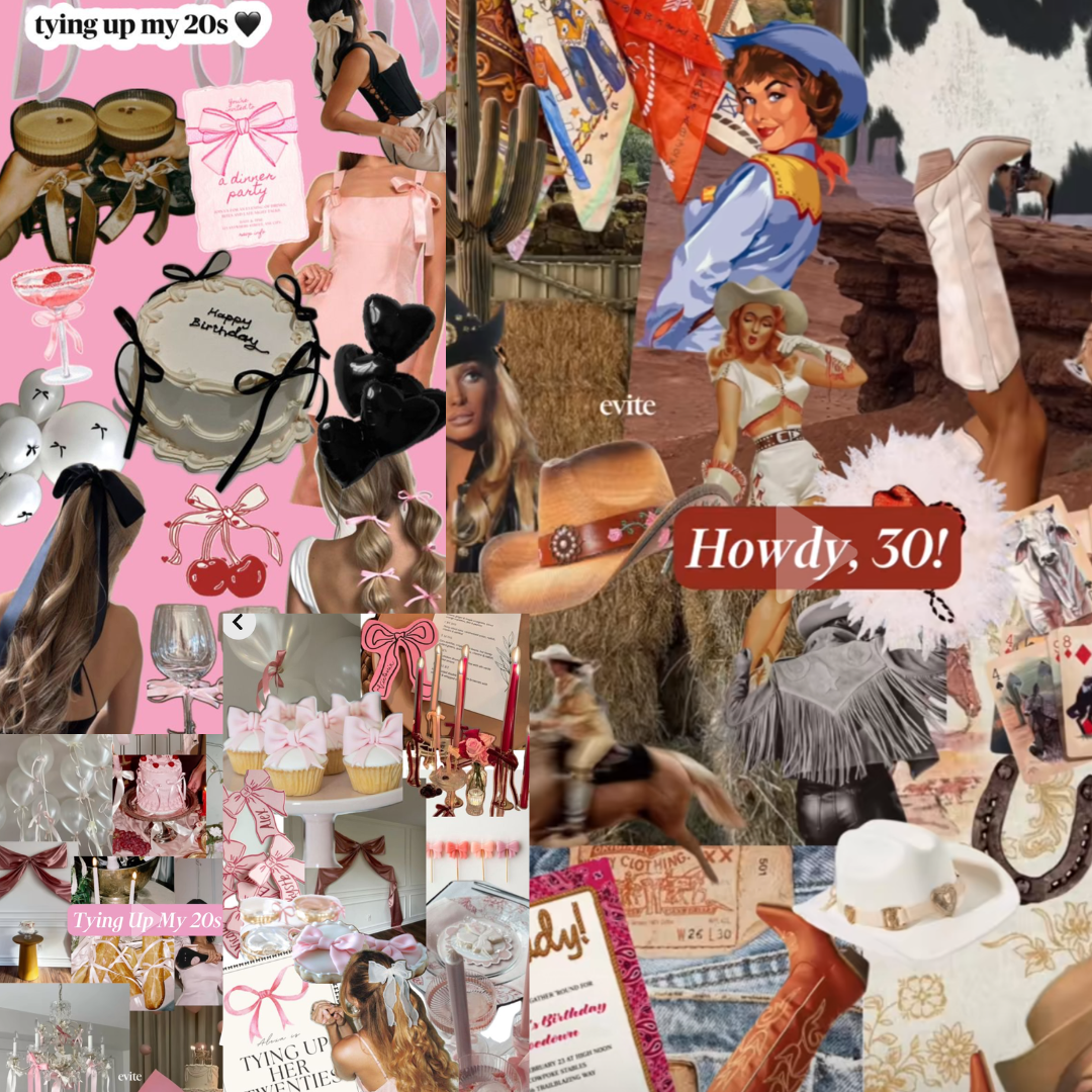 The 30 lassoing the “twenties” was my favorite concept, but I couldn’t find the right lasso and 30 rope letter to match. Instead of taking the time to figure that out, I came up with the second version with alternative rope ties that were easily available in Canva elements. These designs had layers on layers: first denim, then paper, then paisley with a stitch and bows border, and rope elements on top. They’re cute but with 2D and 3D and images it was all too much.