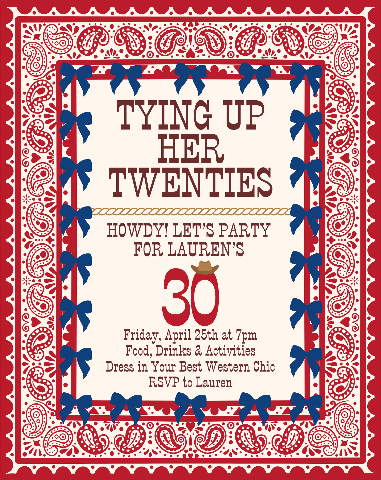 My sister asked me to design the invite for her 30th birthday party. She was conflicted between a “tying up my twenties” bow theme and western, so we combined them into a Western Chic theme.